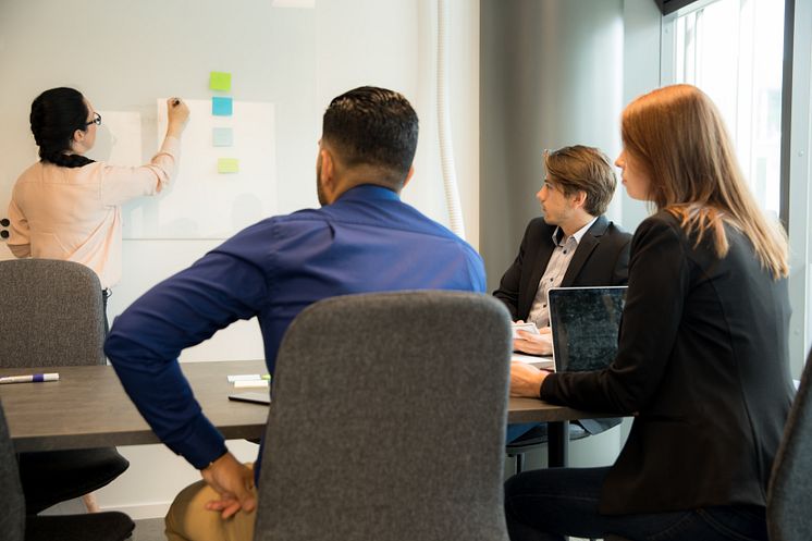 Några personer sitter i ett möte runt ett bord och tittar på en white board, där en person satt upp post it-lappar och skriver anteckningar.