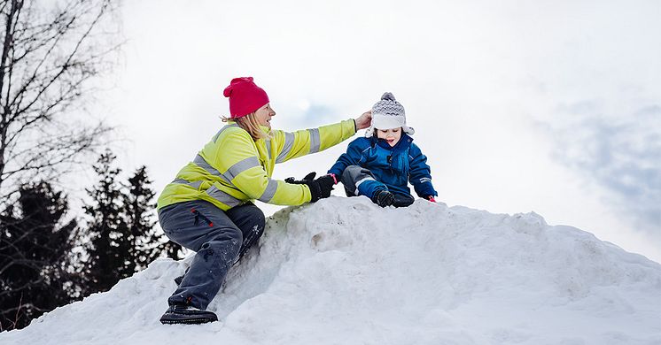 Förskolepedagog hjälper litet barn uppe på en snöhög.