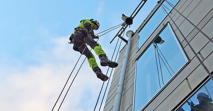En person i gula och grå arbetskläder och skyddshjälm, hänger i en lina med sele vid en husfasad.