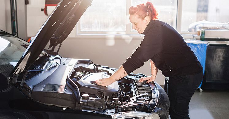 En bilmekaniker står med öppen motorhuv på en bilverkstad. Hon har mörkblå arbetskläder och rött hår uppsatt i hästsvans.