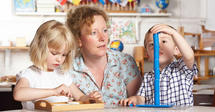 En pedagog sitter med två barn i förskolemiljö vid ett bord. Det ena barnet bygger ett torn av blåa runda klossar och det andra barnet pysslar på en träbricka.