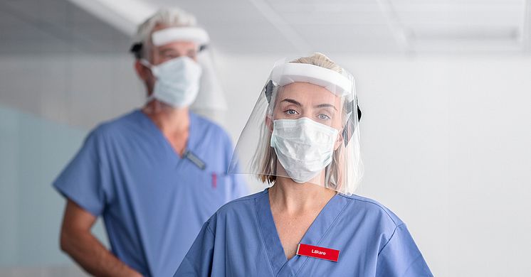 Två läkare i ljusblå läkarrockar, munskydd och plastvisirskydd framför ansiktet.