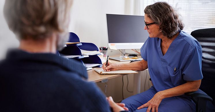 En läkare sitter vid sitt skrivbord och skriver i ett block. Mittemot sitter en patient med ryggen vänd mot kameran.