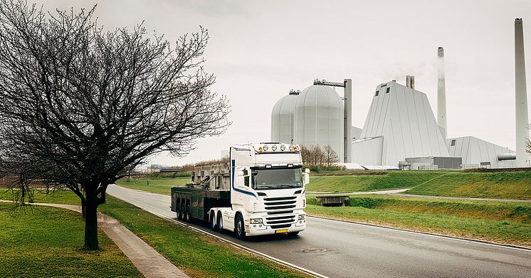 En lastbil kör på en väg förbi en fabrik som syns i bakgrunden.