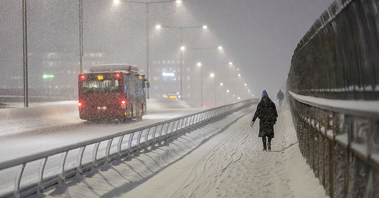 Snöig väg där en röd buss passerar en kvinna som går på trottoaren.