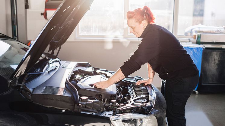 En bilmekaniker står med öppen motorhuv på en bilverkstad. Hon har mörkblå arbetskläder och rött hår uppsatt i hästsvans.