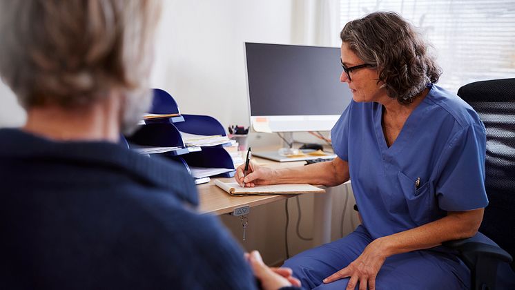 En läkare sitter vid sitt skrivbord och skriver i ett block. Mittemot sitter en patient med ryggen vänd mot kameran.
