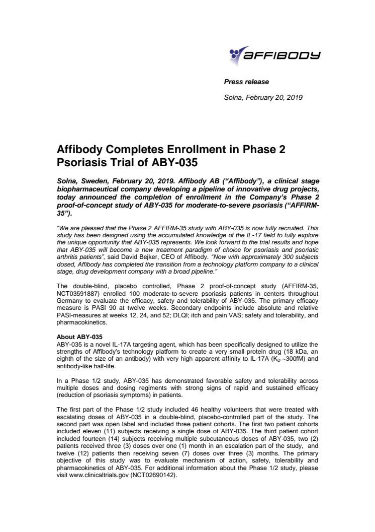 Solna, Sweden, February 20, 2019. Affibody AB (“Affibody”), a clinical stage biopharmaceutical company developing a pipeline of innovative drug projects, today announced the completion of enrollment in the Company’s Phase 2 proof-of-concept study of ABY-035 for moderate-to-severe psoriasis (“AFFIRM-35”).