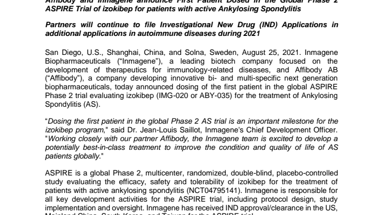 San Diego, U.S., Shanghai, China, and Solna, Sweden, August 25, 2021. Inmagene Biopharmaceuticals (“Inmagene”), a leading biotech company focused on the development of therapeutics for immunology-related diseases, and Affibody AB (“Affibody”), a company developing innovative bi- and multi-specific next generation biopharmaceuticals, today announced dosing of the first patient in the global ASPIRE Phase 2 trial evaluating izokibep (IMG-020 or ABY-035) for the treatment of Ankylosing Spondylitis (AS).