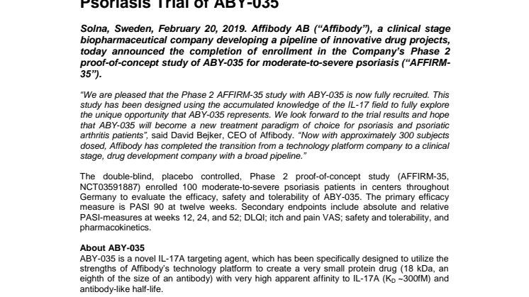 Solna, Sweden, February 20, 2019. Affibody AB (“Affibody”), a clinical stage biopharmaceutical company developing a pipeline of innovative drug projects, today announced the completion of enrollment in the Company’s Phase 2 proof-of-concept study of ABY-035 for moderate-to-severe psoriasis (“AFFIRM-35”).