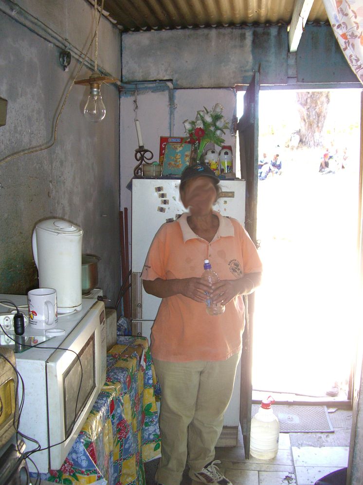 Situationen för arbetare på vingårdar i Sydafriak varierar. Här en familj som bor i ett skjul utan tillgång till toalett eller ordentligt skydd mot väder och vind. Lönen räcker inte för de kostnader ett värdigt liv innebär.