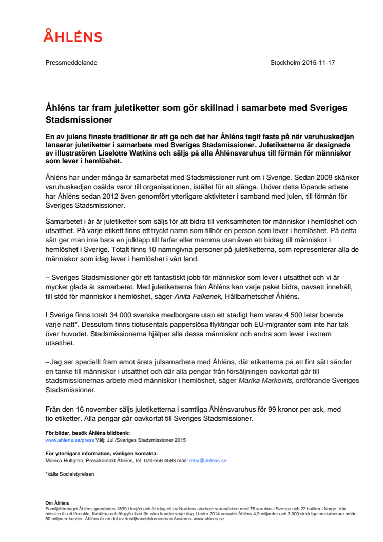 Åhléns tar fram juletiketter som gör skillnad i samarbete med Sveriges Stadsmissioner