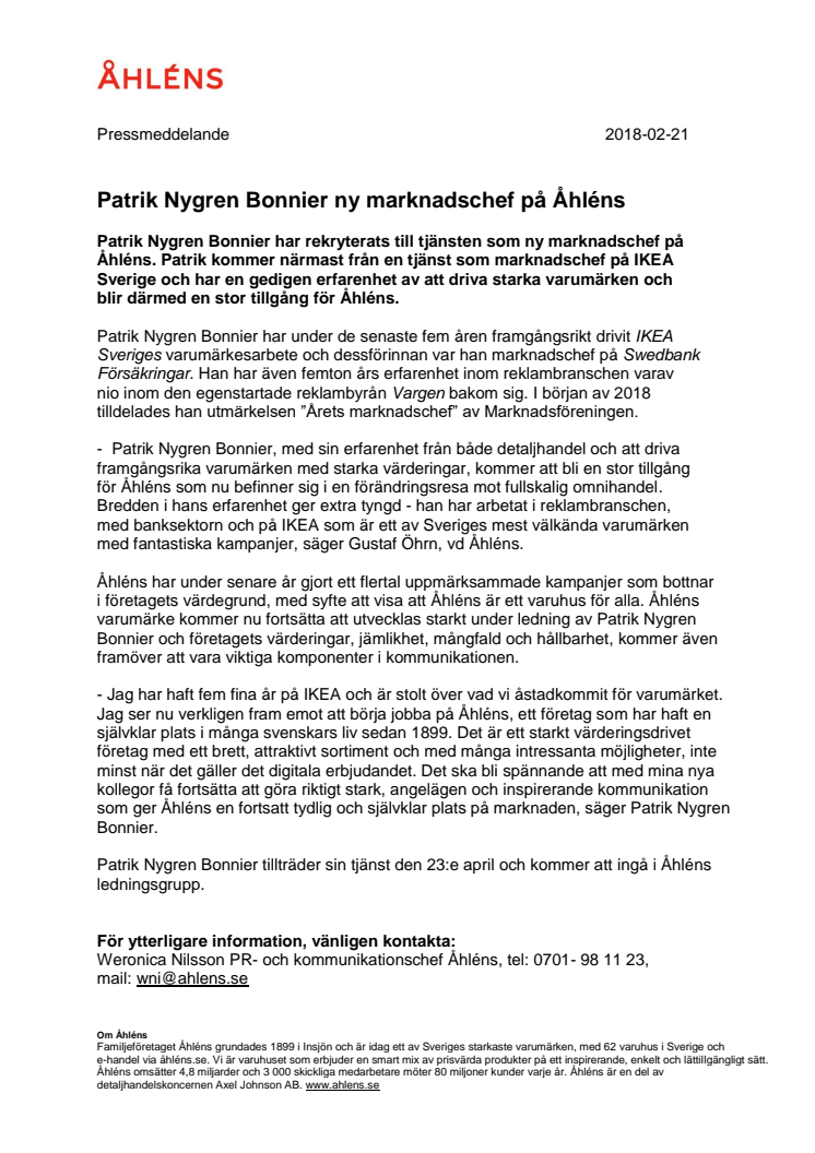 Patrik Nygren Bonnier har rekryterats till tjänsten som ny marknadschef på Åhléns. Patrik kommer närmast från en tjänst som marknadschef på IKEA Sverige och har en gedigen erfarenhet av att driva starka varumärken och blir därmed en stor tillgång för Åhléns.