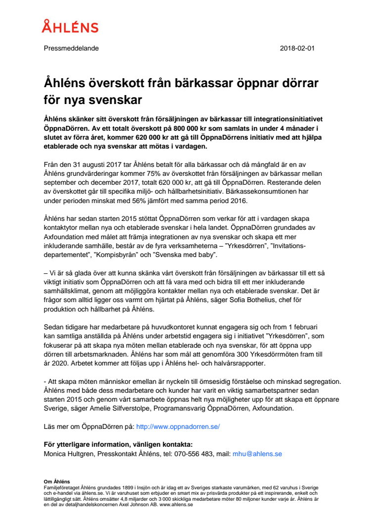 Åhléns skänker sitt överskott från försäljningen av bärkassar till integrationsinitiativet ÖppnaDörren. Av ett totalt överskott på 800 000 kr som samlats in under 4 månader i slutet av förra året, kommer 620 000 kr att gå till ÖppnaDörrens initiativ med att hjälpa etablerade och nya svenskar att mötas i vardagen.