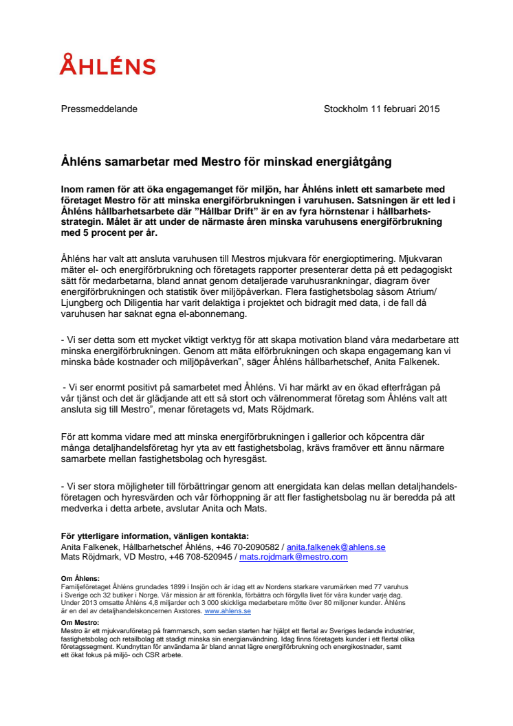 vår tjänst och det är glädjande att ett så stort och välrenommerat företag som Åhléns valt att ansluta sig till Mestro”, menar företagets vd , Mats Röjdmark.