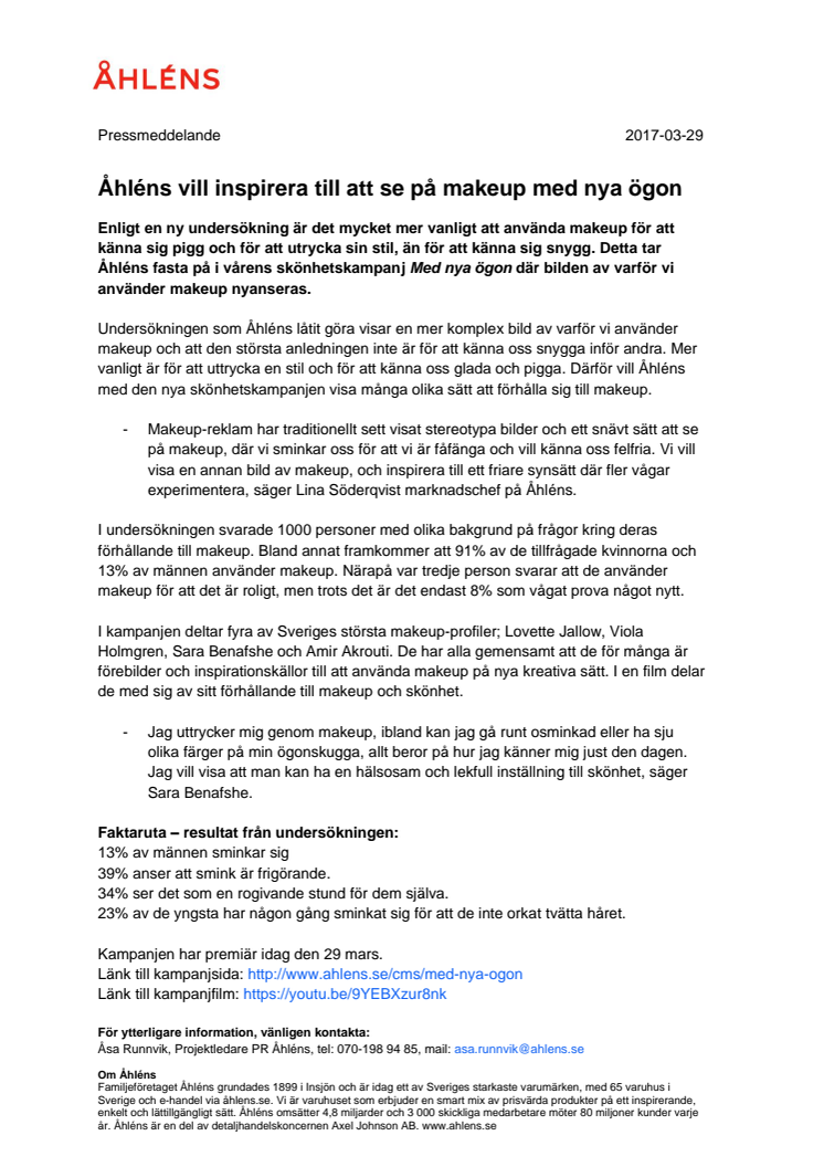 Åsa Runnvik, Projektledare PR Åhléns, tel: 070-198 94 85, mail: asa.runnvik@ahlens.se