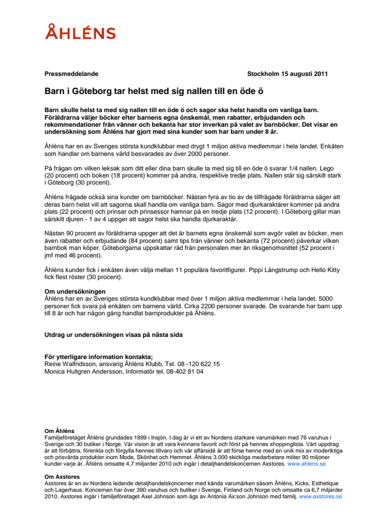 Åhléns har en av Sveriges största kundklubbar med över 1 miljon aktiva medlemmar i hela landet. 5000 personer fick svara på enkäten om barnens värld. Cirka 2200 personer svarade. De svarande har barn upp till 8 år och har någon gång handlat barnprodukter på Åhléns.