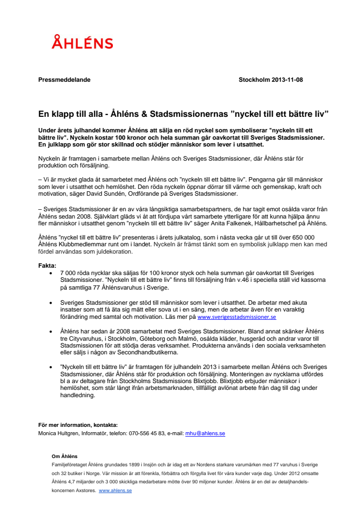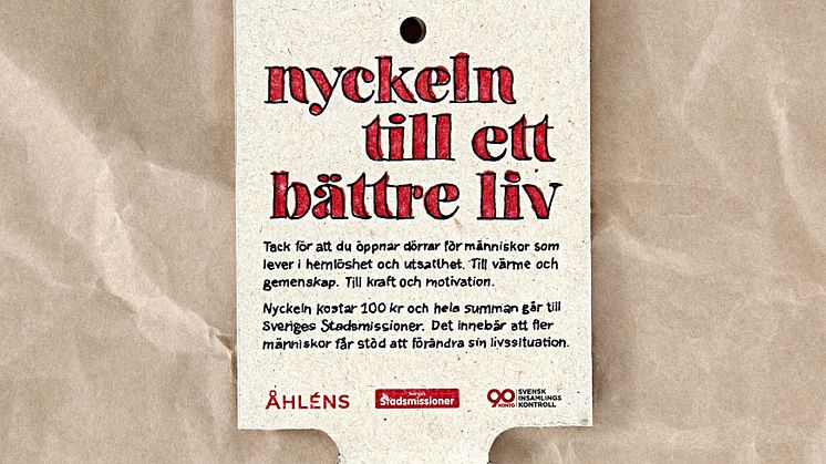 · 7 000 röda nycklar ska säljas för 100 kronor styck och hela summan går oavkortat till Sveriges Stadsmissioner. ”Nyckeln till ett bättre liv” finns till försäljning från v.46 i speciella ställ vid kassorna på samtliga 77 Åhlénsvaruhus i Sverige.
