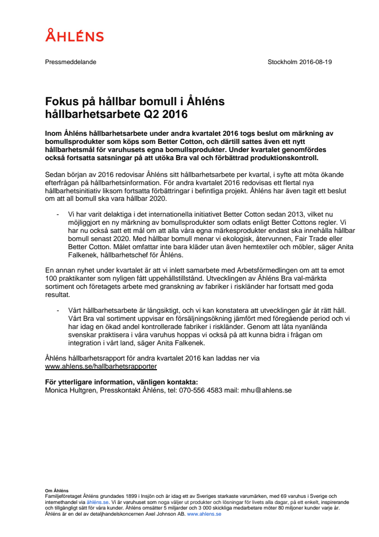 Inom Åhléns hållbarhetsarbete under andra kvartalet 2016 togs beslut om märkning av bomullsprodukter som köps som Better Cotton, och därtill sattes även ett nytt hållbarhetsmål för varuhusets egna bomullsprodukter. Under kvartalet genomfördes också fortsatta satsningar på att utöka Bra val och förbättrad produktionskontroll.