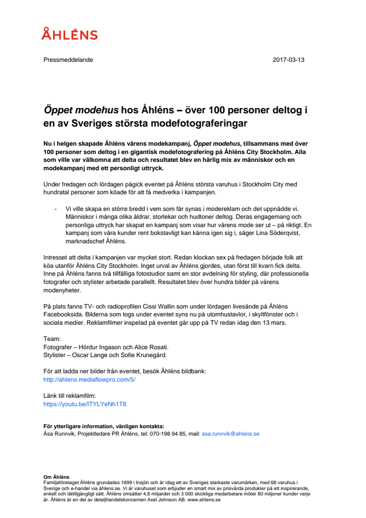 Åsa Runnvik, Projektledare PR Åhléns, tel: 070-198 94 85, mail: asa.runnvik@ahlens.se