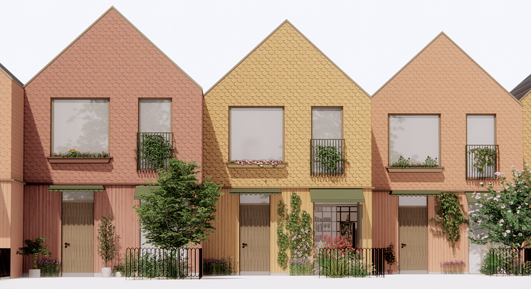 Fasadutsnitt radhus. Radhusen har sadeltak klädda med solpaneler och enkel takfot.