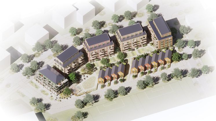 Flygbild som visar de tre hustyperna - torghus, kvartershus och radhus, samt de olika gårdsrummen och lilla torget.