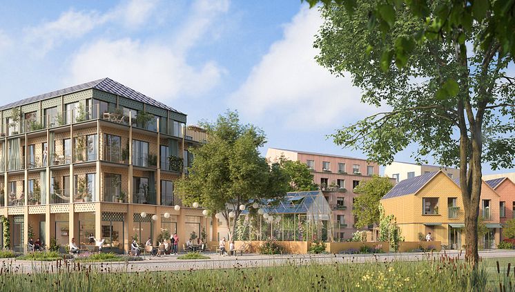 Torg i fint solläge ger kvalitet åt hela stadsdelen. Med torghuset vill vi skapa ett välkomnande hörn ut mot det nya lilla torget i form av ett utsmyckat hus med inbjudande café. Det lilla torget skapar en plats att mötas på mellan kvarter, idrottshall och park. Kvartershus med balkonger mot gård.