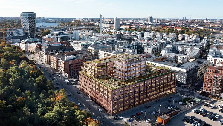 Flygvy. Illustration av Trikåfabriken 8 i Hammarby sjöstad.