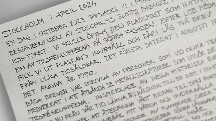 En dag i oktober år 2023 samlades vi i projektgruppen för restaureringen av Stockholms slotts fasader på projektkontoret. Vi skulle öppna den flaskpost som hittas i en av trofégrupperna på södra fasaden. Efter lite möda fick vi ut flaskans innehåll och däri låg två brev från olika tidsåldrar. Det första daterat i augusti 1898, det andra år 1990.