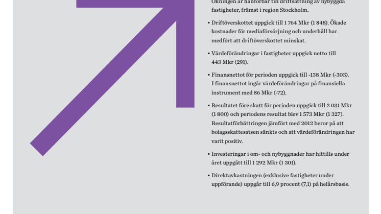 resultat efter skatt uppgående till 1 573 Mkr (1 327). Hyresintäkterna uppgår till 2 686 Mkr (2 649) och driftöverskottet till 1 764 Mkr (1 848). Driftöverskottet har försämrats främst beroende på ökade drift- och underhållskostnader. Fastigheternas avkastningsnivåer är oförändrade och bedöms vara så under året.