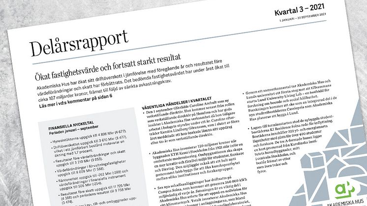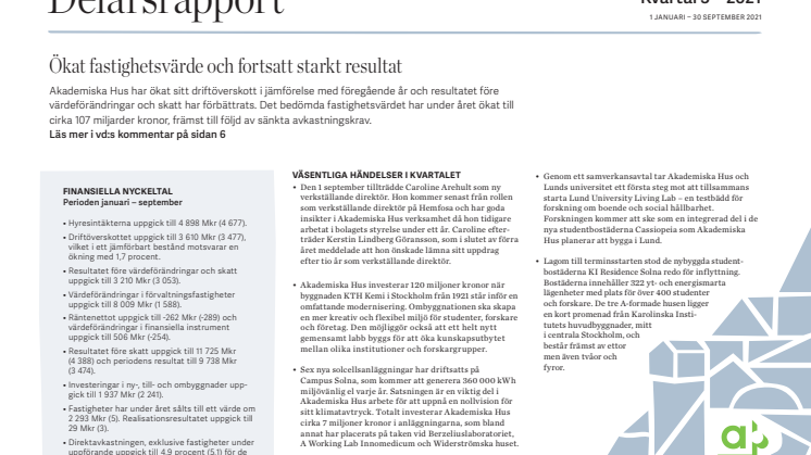 Akademiska Hus delårsrapport 1 januari – 30 september 2021: Ökat fastighetsvärde och fortsatt starkt resultat