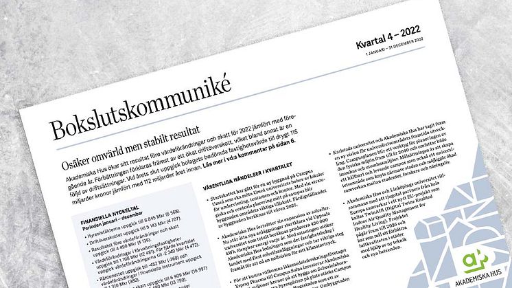 - 2022 har varit ett turbulent år på många sätt. Rysslands invasion av Ukraina förändrade på kort tid det geopolitiska landskapet och året har präglats av stigande inflation, stigande räntenivåer och elpriser på en rekordhög nivå. Omständigheterna till trots har vi lyckats ställa om efter nya förutsättningar för att fortsätta leverera värde till våra kunder och vår ägare och för att utveckla våra campus. Vi har ett ständigt fokus på vår basleverans så att klimat, funktion och upplevelse i våra lokaler är den bästa. Att vi dessutom har en unik finansieringsbas gör att vi sammantaget har en riktigt stark plattform att stå på, vilket känns extra viktigt när utmaningarna för oss som fastighetsbolag är större än någonsin, säger Caroline Arehult, vd för Akademiska Hus.