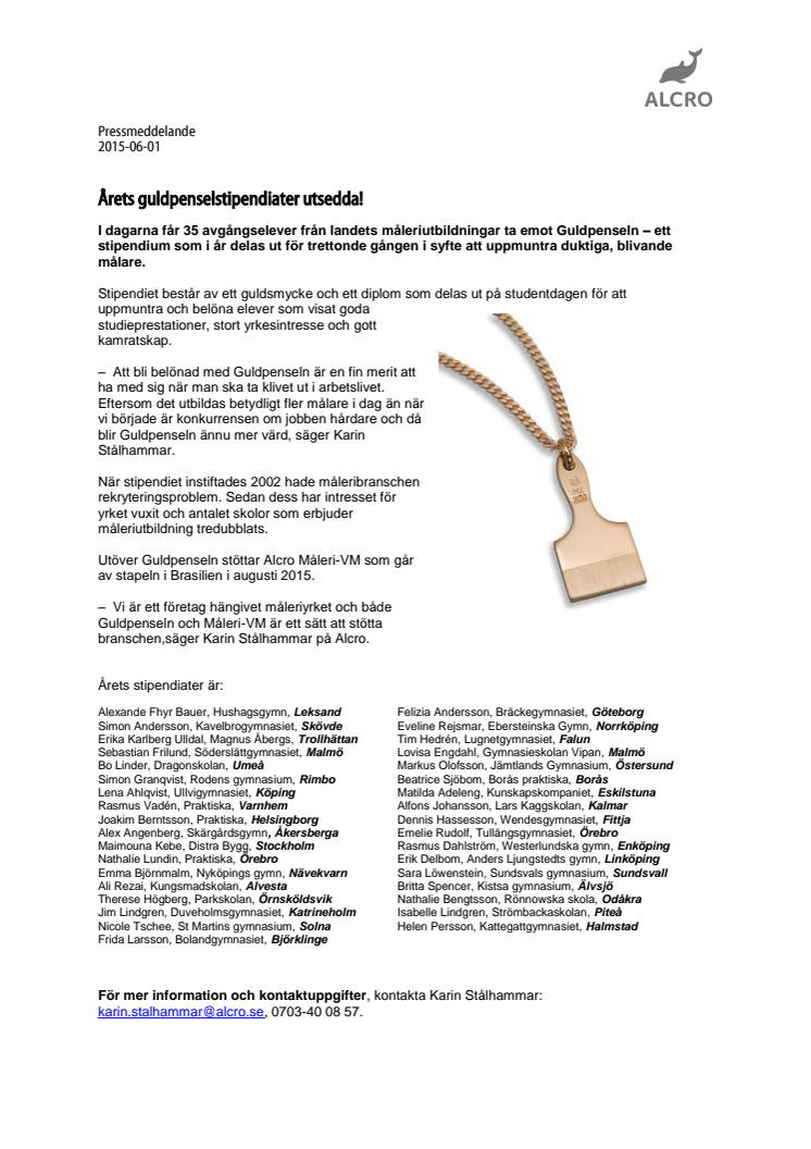 I dagarna får 35 avgångselever från landets måleriutbildningar ta emot Guldpenseln – ett stipendium som i år delas ut för trettonde gången i syfte att uppmuntra duktiga, blivande målare.