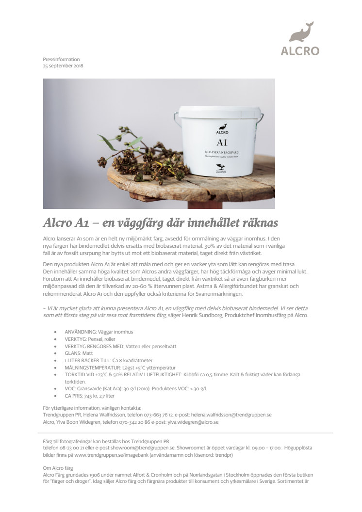 Alcro lanserar A1, en helt ny färg med delvis biobaserade ingredienser, avsedd för ommålning av väggar inomhus. I den nya färgen har de organiska ingredienserna delvis ersatts med biobaserat material. 30 procent av det material som i vanliga fall är av fossilt ursrpung har bytts ut mot ett biobaserat material, taget direkt från växtriket.