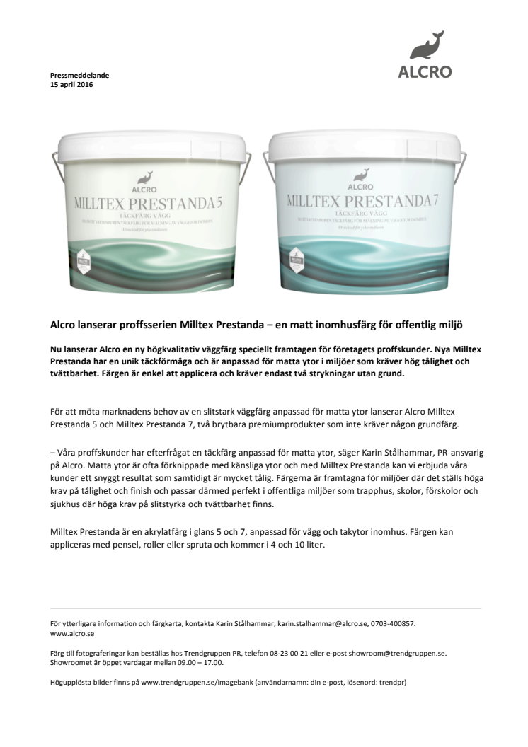 Nu lanserar Alcro en ny högkvalitativ väggfärg speciellt framtagen för företagets proffskunder. Nya Milltex Prestanda har en unik täckförmåga och är anpassad för matta ytor i miljöer som kräver hög tålighet och tvättbarhet. Färgen är enkel att applicera och kräver endast två strykningar utan grund.