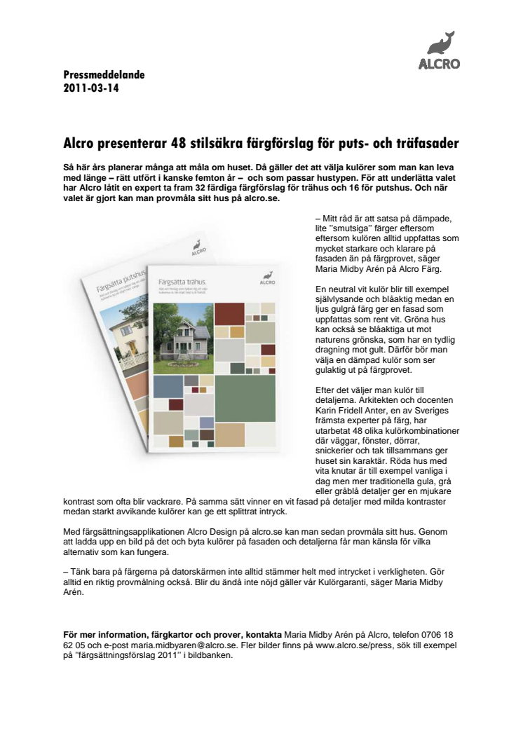 Så här års planerar många att måla om huset. Då gäller det att välja kulörer som man kan leva med länge - rätt utfört i kanske femton år - och som passar hustypen. För att underlätta valet har Alcro låtit en expert ta fram 32 färdiga färgförslag för trähus och 16 för putshus. Och när valet är gjort kan man provmåla sitt hus på alcro.se.
