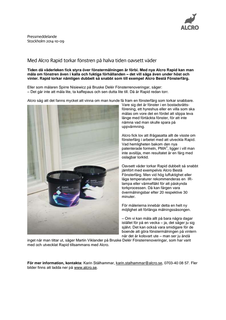 Tiden då väderleken fick styra över fönstermålningen är förbi. Med nya Alcro Rapid kan man måla om fönstren även i kalla och fuktiga förhållanden – det vill säga även under höst och vinter. Rapid torkar nämligen dubbelt så snabbt som till exempel Alcro Bestå Fönsterfärg.