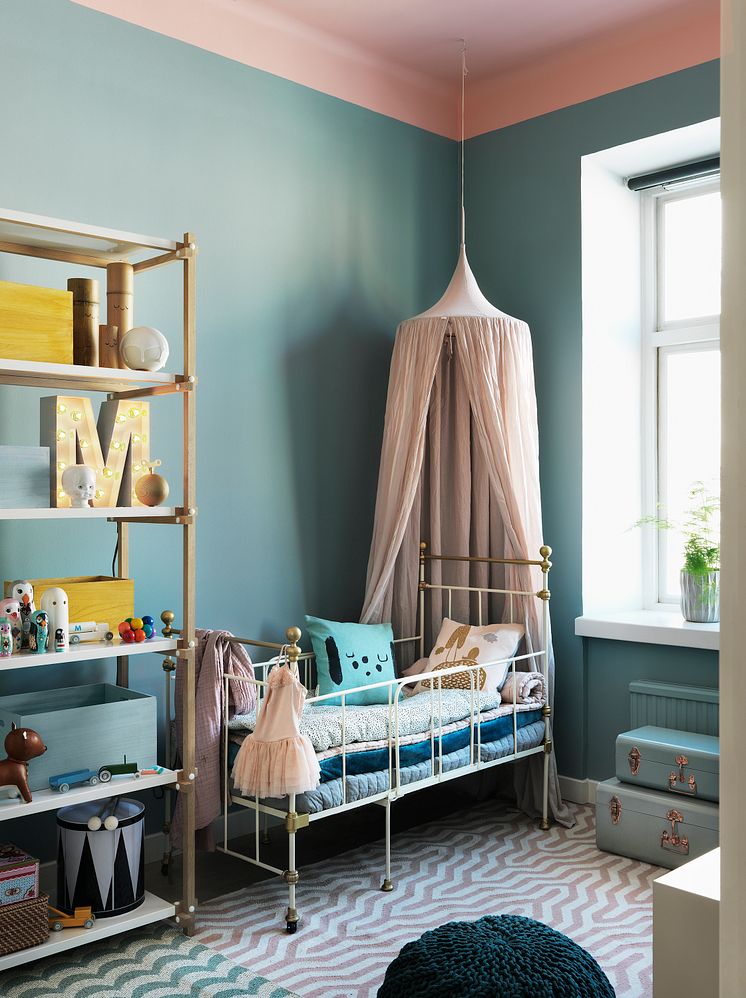 Kulör: 734 Blåstång Tak: 712 Landsort, Säng: Mässing Metallic och 760 Bleke, Trälådor i Träbets 929 Syre och 931 Smörblomma