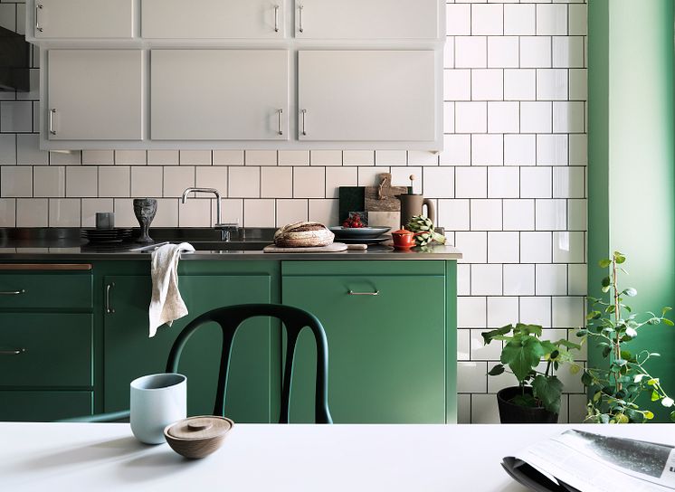 Våga tänka nytt kring färgsättning i köket. Olika kulör på under- och överskåp, där något av dem går ton-i-ton med väggfärgen, ger ett elegant och lekfullt intryck.