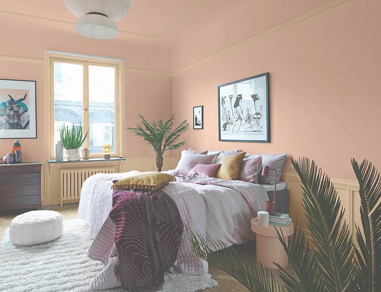 Vägg, sängbord och tak är målat i kulören i Old Rose