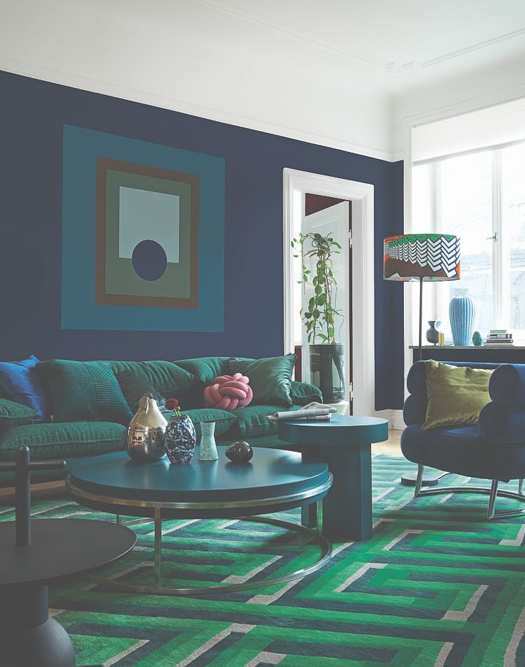 Väggmålningen är en blandning av kulörerna Oktan, Chicken Coop, Brownie och Blåstång.
