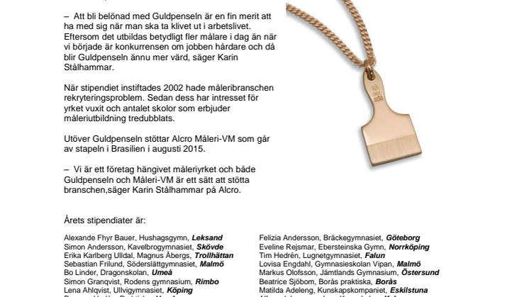 Utöver Guldpenseln stöttar Alcro Måleri-VM som går av stapeln i Brasilien i augusti 2015.
