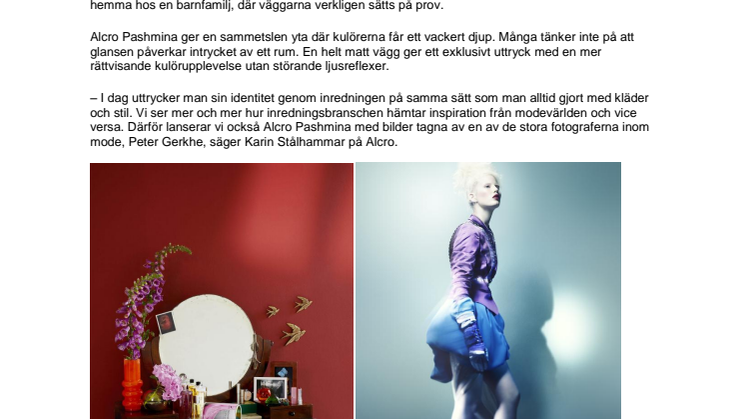 – I dag uttrycker man sin identitet genom inredningen på samma sätt som man alltid gjort med kläder och stil. Vi ser mer och mer hur inredningsbranschen hämtar inspiration från modevärlden och vice versa. Därför lanserar vi också Alcro Pashmina med bilder tagna av en av de stora fotograferna inom mode, Peter Gerkhe, säger Karin Stålhammar på Alcro.