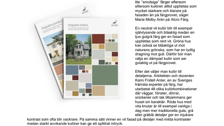 Så här års planerar många att måla om huset. Då gäller det att välja kulörer som man kan leva med länge - rätt utfört i kanske femton år - och som passar hustypen. För att underlätta valet har Alcro låtit en expert ta fram 32 färdiga färgförslag för trähus och 16 för putshus. Och när valet är gjort kan man provmåla sitt hus på alcro.se.