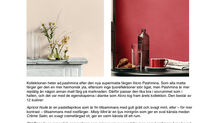 Inspirationen till Alcros femtonde kulörkollektion är hämtad från den färg- och mönsterglädje som syns i både mode och inredningstrender just nu. Även om det ljusa ännu dominerar i inredningssammanhang så kommer det allt mer kulörta och mörka kulörer för våra väggar. Därför samsas mjuka pasteller med mer intensiva färger i kollektionen ad.pashmina.