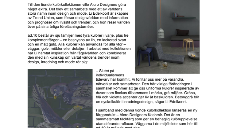 Alcros tionde kulörkollektion, ad.10, är signerad Li Edelkoort och omfattar 31 kulörer att inspireras och använda sig av. ad.10 signalerar att en ny, mörkare inredningstrend tar över efter allt det vita. Samtidigt introduceras en produktserie med namnet Alcro Designers.