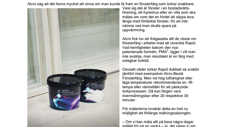 Alcro såg att det fanns mycket att vinna om man kunde få fram en fönsterfärg som torkar snabbare. Vare sig det är fönster i en bostadsrättsförening, ett hyreshus eller en villa som ska målas om vore det en fördel att slippa leva länge med förtäckta fönster, för att inte nämna vad man skulle spara på uppvärmning.