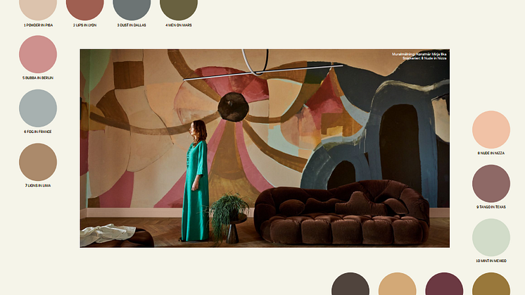 Alcro Färg presenterar nu ett nytt spännande kulörsamarbete med entreprenören, influencern och designern Marie Olsson Nylander. Kulörerna är döpta efter en stad, ett land eller en annan plats som ger rum för fantasin. Kollektionen förmedlar vänlighet, lekfullhet och kärlek genom sina varma nyanser – en intensiv vinröd, olika toner av beige och rosa, en mjuk svart och dimmiga blåtoner. Palettens filosofi är att det ska vara något som fångar ens blick, får dig att stanna upp och tänka två gånger. Alla färger är designade för att komplettera varandra, vilket får de andra färgerna att blomma