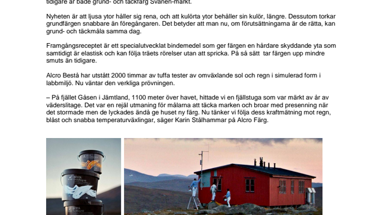Efter flera års utvecklingsarbete och tester är nya Alcro Bestå fasadfärg klar för lansering. Resultatet gör att fasaden ser nymålad ut längre. Nu sätts färgen på prov i verkligheten i tuffast tänkbara miljö: en fjällstuga på fjället Gåsen i Jämtland.
