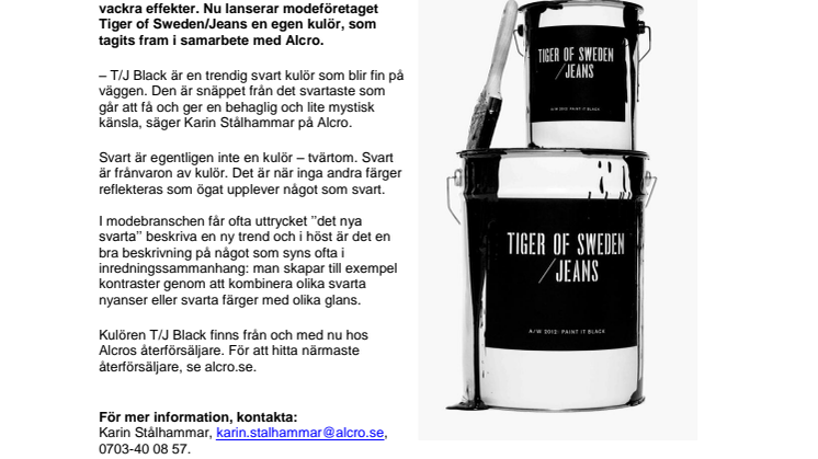 Modevärldens ständiga favoritkulör svart är i höst hetare än vanligt. Även inom inredning används olika svarta färger för att skapa vackra effekter. Nu lanserar modeföretaget Tiger of Sweden/Jeans en egen kulör, som tagits fram i samarbete med Alcro.